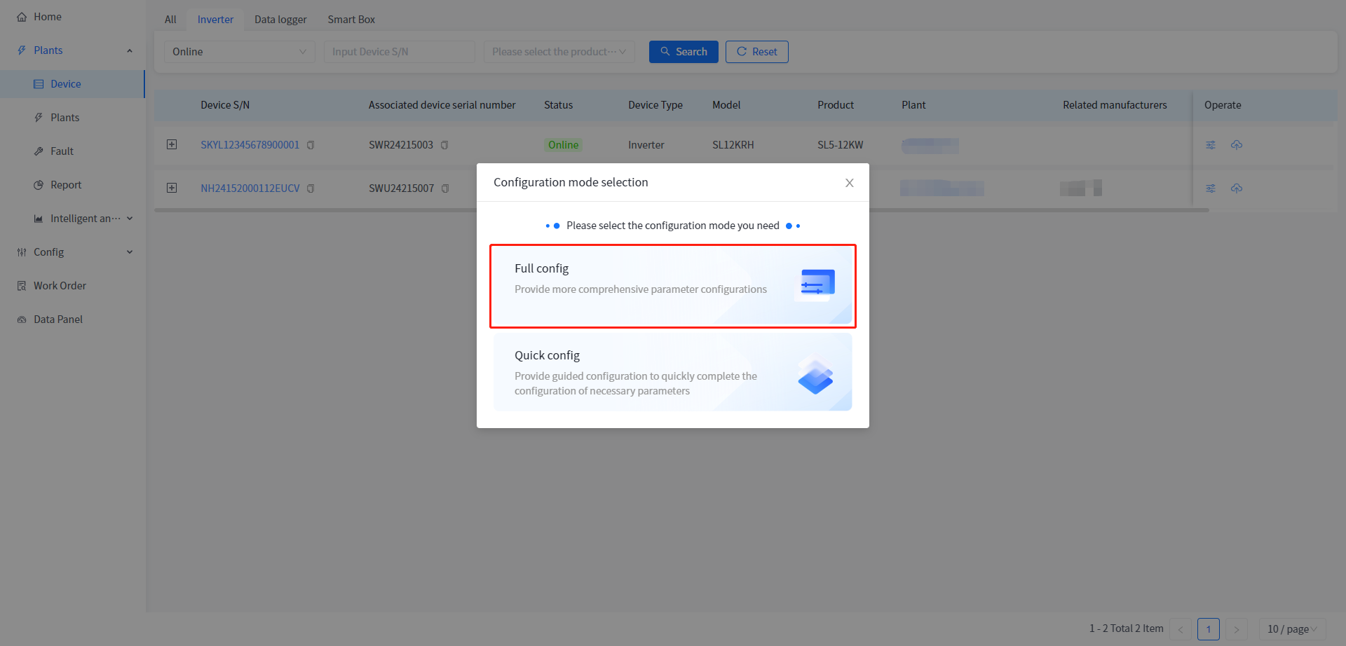 ② Click the [Parameter] button on the right.(If the device of this model supports quick configuration, then the configuration mode selection pop-up window will pop up after clicking the configuration button. If the device does not support quick configuration, the page will directly enter the parameter configuration page.)