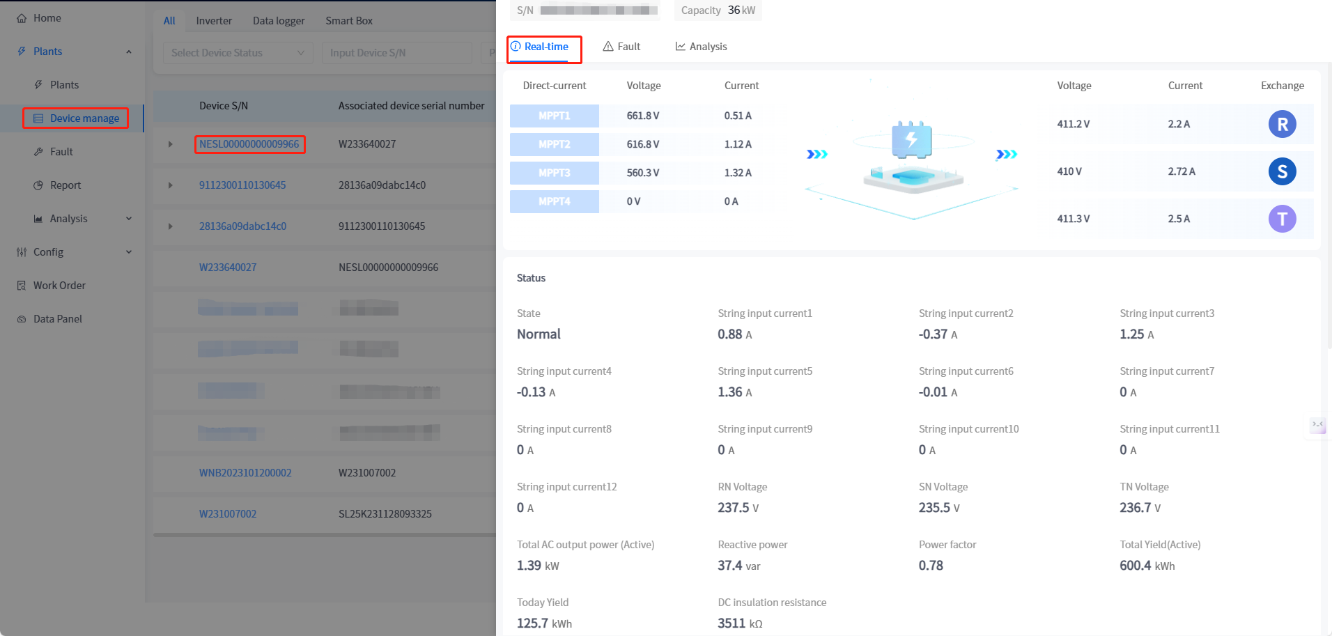 The system displays the detailed working data of the Device in the page of Device infor - real-time information, including: Device status, power generation data, network data, temperature, control and version details (updated once every five minutes).